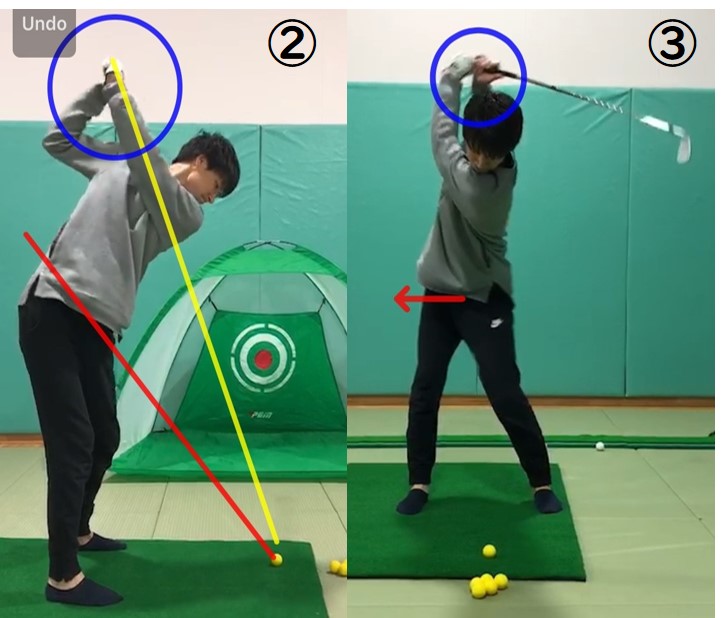 身体の柔軟性は高く、大きく振れてしまうだけに『スウェイ』が強調され『ダフリ』『トップ』が増えてしまったのでしょう。トップの高さをおさえるだけでミート率は向上すると思います。しかし、トップの位置をおさえるだけでは飛距離は若干落ちてしまいます。スウェイを抑制しつつ、トップの位置をおさえても飛距離が落ちない練習法を以下にご紹介しておきますので、参考にしてみてください。